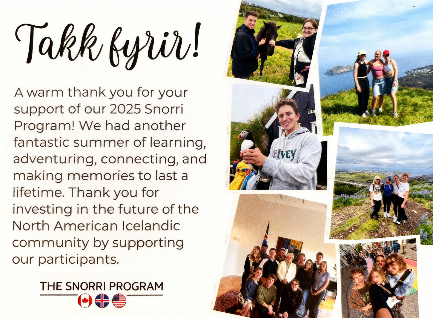 The Canada Iceland Foundation played a key role in making the tour possible by providing a grant that supported photographic documentation. Thanks to this funding, photographer Signý Thorsteinsson was able to capture striking images of the sites along the route. Her framed photographs were later exhibited at the Winnipeg Scandinavian Cultural Centre, allowing visitors to experience the journey visually and reflect on the Icelandic presence that endures in Winnipeg’s landscape.